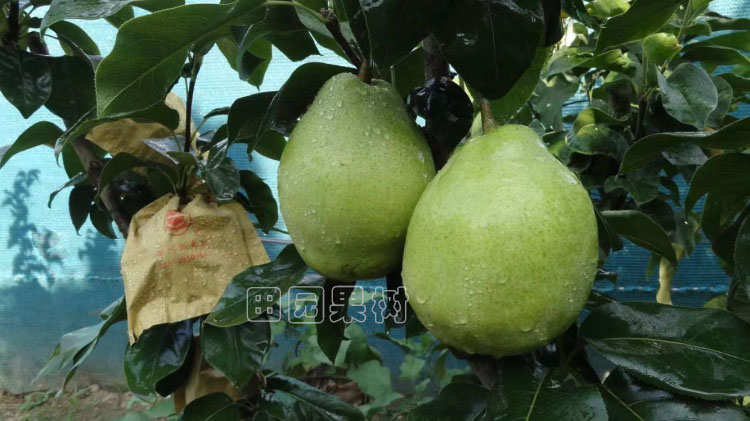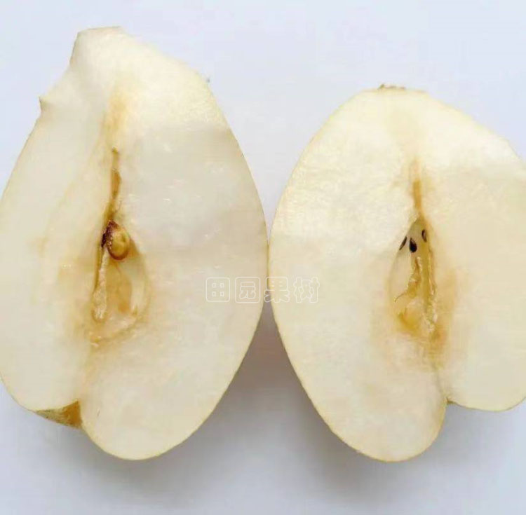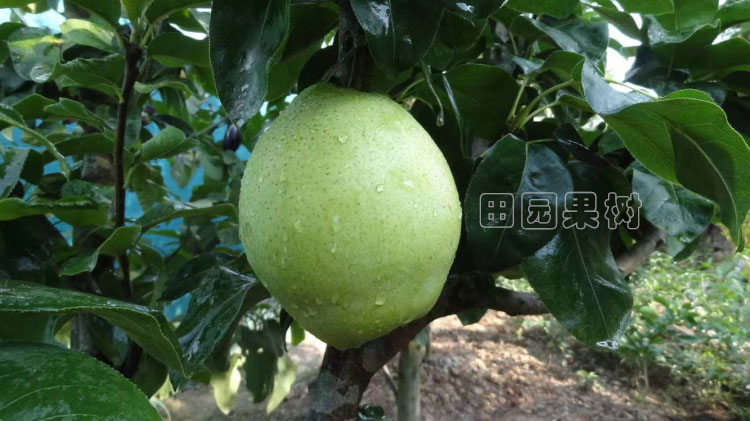 該品種樹勢強健,開始結果早,果實歪瓢形至卵圓形,母樹平均果重263.3g,后代平均果重300克以上,大可達900克,果皮黃綠色,光滑,果肩部果多繡,果肉白色,抗氧化,肉質細嫩,酥脆化渣,果心極小,氣味甜、汁多,可固物13—14%,儲藏后風味更佳,在溫控90C儲藏3月后,腐爛率1%,可固物仍達13以上%,成都地區7月下旬至八月份成熟,套雙層袋后果面為乳白色,7月下旬即可采收食用,進入8月份味道香甜如蜜,肉質中沒有石細胞,味道酷似新疆庫爾勒香梨。