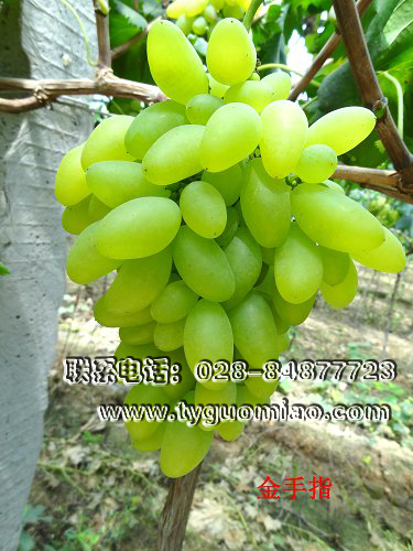 【金手指葡萄】,歐美雜交種。由日本葡萄育種家田一于1982年雜交育成。果穗長圓錐形,果粒著生中等緊密或偏緊,平均穗重500克。果粒長橢圓形,略彎曲,呈弓形,平均粒重8.5克,重大粒重可達13克。果皮薄,黃綠色,果粉厚。果肉軟硬適中,味甜爽口,無酸味,稍有玫瑰香味,可溶性固形物含量約為20%,品質優良。每個果粒含種子1~3粒,種子與果肉易分離。3月下旬萌芽,5月上中旬開花,8月上旬漿果成熟。生長勢中庸,始果期早。適于各種架式和樹形,以中梢修剪為主,抗病性與巨峰大致相當。